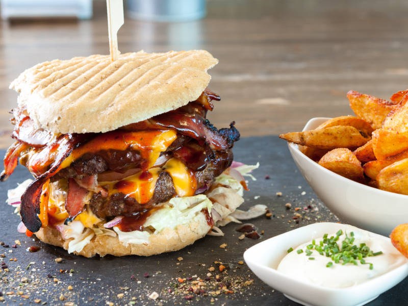 Weizenbrötchen / gegrillter Bacon / BBQ-Sauce / Käse / Röstzwiebeln